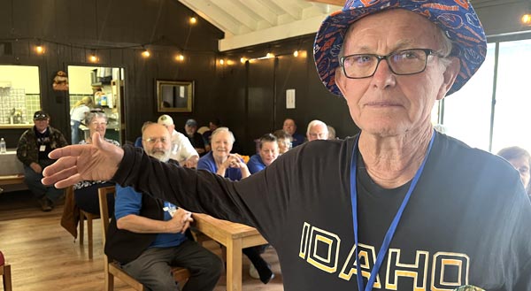 Ron embracing his absent partner, Mike. They won the cornhole tournament.